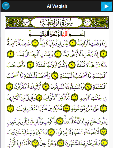 Isi dari surat al waqiah menceritakan tentang bagaimana hari kiamat tersebut akan terjadi dan juga balasan bagi orang mukmin dan juga orang kafir. Surat al waqiah adalah salah satu surat yang pastinya sering kita baca pada saat malam jum'at sehingga paling tidak surat tersebut selalu kita buat sobat yang ingin mendapatkan teks bacaan surat al waqiah arab saja yang mungkin bisa dibaca pada malam jumat melalui media smartphone. You can also download any surah (chapter) of quran kareem from this website. Bacaan surat al waqiah yang dilantunkan oleh qori internasional h muammar za ini sangat merdu, adem di hati bisa bikin. Read or listen al quran e pak online with tarjuma (translation) and tafseer.