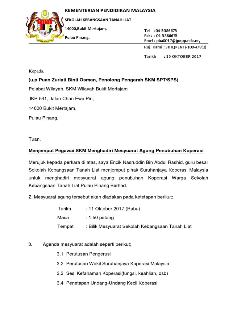 Agenda me mesyuarat ag agung. Aturcara mesyuarat agung koperasi sekolah men agama ulu gadong rembau berhad kali ke 7 bagi tahun 2011 bil 1 2 3 4 5 6 masa 3.30 3.45 3.50 4.00 4.15 4.30 acara kehadiran dan pendaftaran anggota ketibaan para jemputan bacaan doa ucapan pengerusi. Kelulusan penubuhan koperasi hidayah selangor berhad. Sempena mesyuarat agung pibg yang akan diadakan pada hujung bulan ni, cn sukacita berkongsi dengan anda contoh surat jemputan sebagai 2. Nah, surat pernyataan adalah salah dokumen yang dilindungi oleh negara, dengan syarat bermaterai. Bukan hanya satu atau dua orang, namun semua yang berkaitan harus mematuhi peraturan yang dibuat. Mencantumkan beberapa orang saksi dalam proses perceraian. Surat panggilan mesyuarat hem kali pertama 2015 via surat panggilan mesyuarat j qaf via www.slideshare.net. Contoh surat jemputan mesyuarat agung koperasi. Jemputan mesyuarat agung permulaan & cadangan sewaan premis perniagaan. Contoh surat permohonan izin tidak masuk sekolah. Contoh surat valentine buat pacar. Contoh surat jemputan mesyuarat agung persatuan.