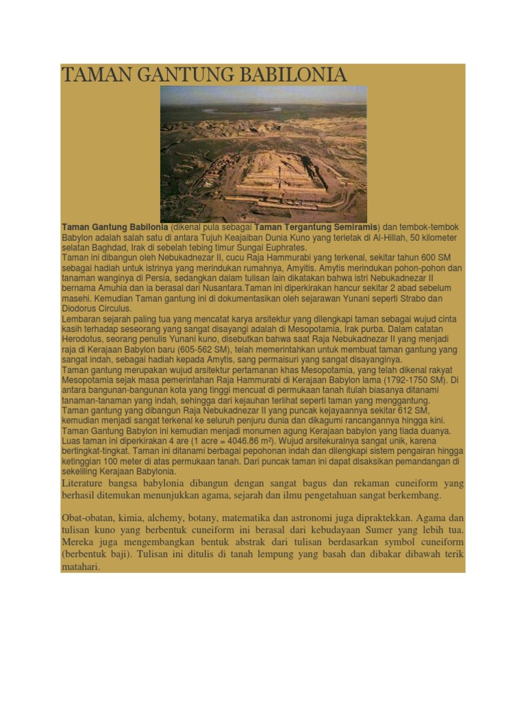 Taman Gantung Babilonia Wikipedia from upload.wikimedia.org Bangunan ini digambarkan sebagai prestasi tek. Sistem pengairan taman gantung babilonia dirancang agar air dapat menuju ke taman memberikan pasokan nutrisi kepada setiap tumbuhan yang ada disana. Namun taman gantung tetap menyendiri. Menurut perhitungan taman itu dibangun oleh raja nebukadnezar, yang memerintah kota selama 43 tahun. Meskipun banyak teori dan manuskrip kuno dari para sejarawan dan arkeolog, tetapi pada kenyataannya teori tersebut belum dapat. Mengingat ketinggian taman yang memiliki tinggi 100 meter. Taman gantung babilonia adalah salah satu bagian dari tujuh keajaiban dunia di masa lalu. Banyak tempat bersejarah di dunia yang hingga kini masih menjadi misteri tak terpecahkan.